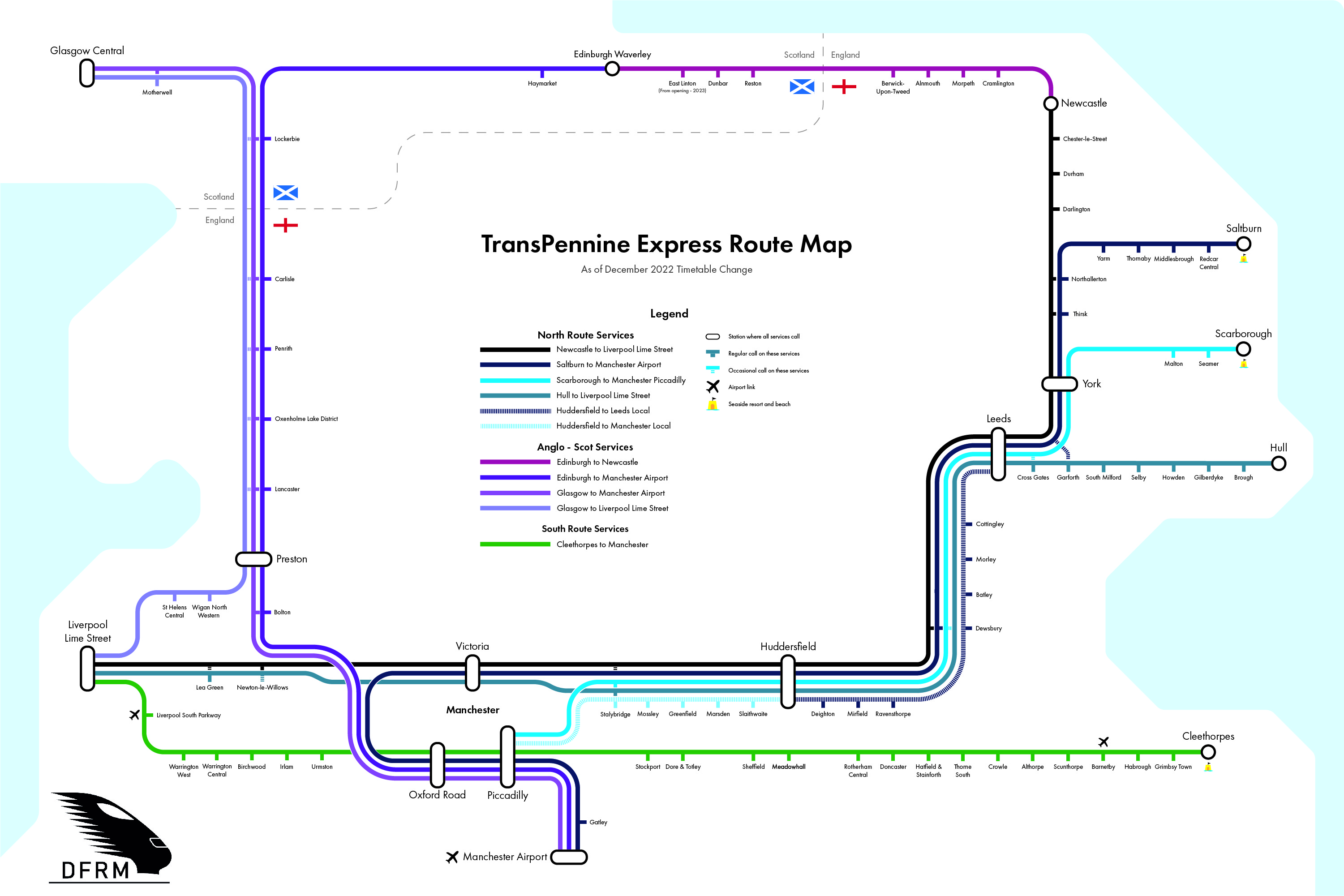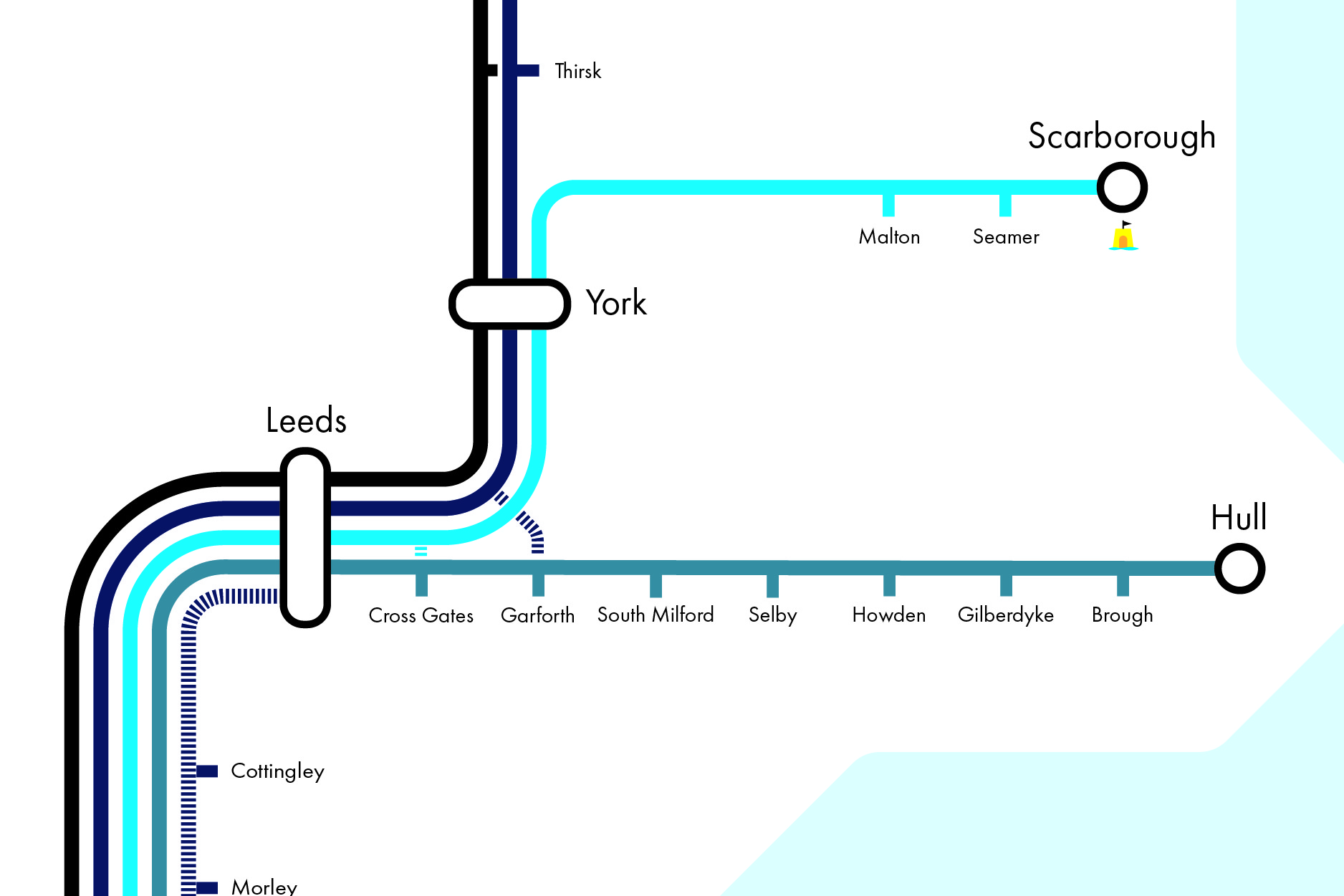 This project looked at the typical route maps produced by the UK Rail Company TransPennine Express. While their existing collateral demonstrated the stretch of their routes, we saw an opportunity to use a different style document to provide additional information.