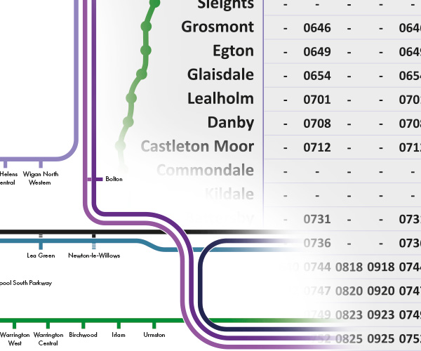 We also offer a range of customer information and cartography services to enhance the overall rail travel experience for customers and provide clear, accurate, and easy-to-use information. These include the design and creation of maps, diagrams, and other visual aids to help customers navigate train stations and understand routes. Alongside this we can produce informational graphics, such as schedules, fare tables and service bulletins, to help customers plan their journey and stay informed about their travel options.